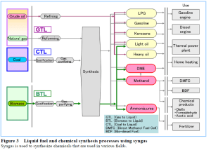 Hydrogen rich syngas is a more value added product and serves not only as a fuel for power generation, but also for cooking, heating and cooling. A schematic flow diagram Fig 3,  Fig4 and Fig 6 (Ref: Mitsubishi Heavy Industries Review) shows how gasification of biomass to syngas can  compete with existing fossil fuels for various applications such as for power generation, as a raw material for various chemical synthesis and as a fuel for cooking, heating and cooling and finally as a liquid fuel for transportation. Bio-gasification has a potential to transform our fossil fuel dependant world into Carbon-free world and to help us to mitigate the global warming.