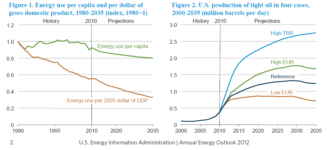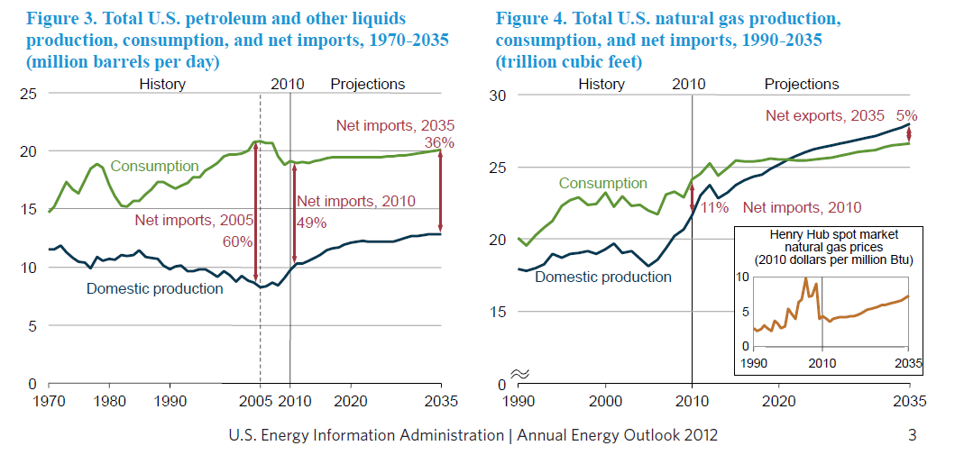 Key results highlighted in AEO2012 include continued modest growth in demand for energy over the next 25 years and increased domestic crude oil and natural gas production, largely driven by rising production from tight oil and shale resources. As a result, U.S. reliance on imported oil is reduced; domestic production of natural gas exceeds consumption, allowing for net exports; a growing share of U.S. electric power generation is met with natural gas and renewable; and energy-related carbon dioxide emissions stay below their 2005 level from 2010 to 2035, even in the absence of new Federal policies designed to mitigate greenhouse gas (GHG) emissions.
