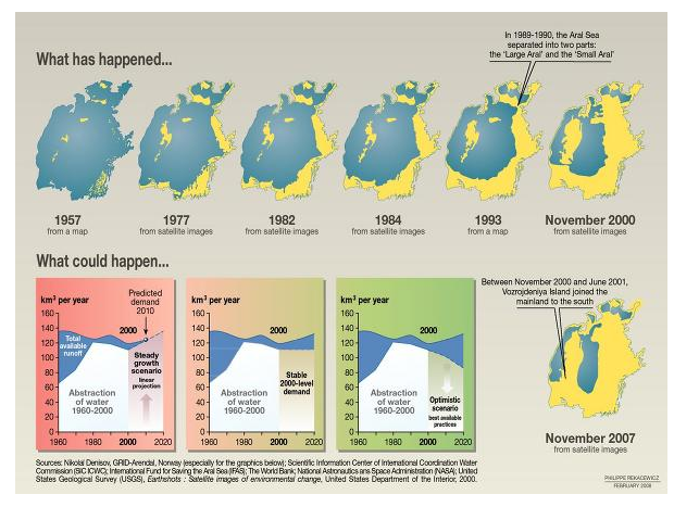 “In the 1960s, the Soviet Union undertook a major water diversion project on the arid plains of Kazakhstan, Uzbekistan, and Turkmenistan. The region’s two major rivers, fed by snowmelt and precipitation in faraway mountains, were used to transform the desert into farms for cotton and other crops. Before the project, the Syr Darya and the Amu Darya rivers flowed down from the mountains, cut northwest through the Kyzylkum Desert, and finally pooled together in the lowest part of the basin. The lake they made, the Aral Sea, was once the fourth largest in the world.