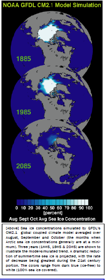 Attached Sea ice concentrations simulated by GFDL’s CM2.1 global coupled climate model averaged over August, September and October (the months when Arctic sea ice concentrations generally are at a minimum). Three years (1885, 1985 & 2085) are shown to illustrate the model-simulated trend. A dramatic reduction of summertime sea ice is projected, with the rate of decrease being greatest during the 21st century part. The colors range from dark blue (ice-free) to white (100% sea ice covered).
