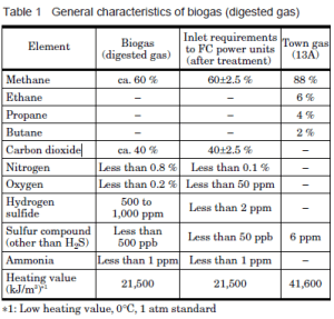 PAFC is a compact, self-contained power generation unit that is used even for base load power. The electrical efficiency of PAFC is about 42% .It is suitable for CHP applications so that the total energy efficiency can reach up to 85%.It is ideal for supplying continuous power 24×7 and also to use waste heat for space heating or space air-conditioning with an absorption chiller in CHP applications. The ideal candidates for PAFC power generation using CHP will be hospitals, super markets, Data centers, Universities or any continuous process industry.PAFC is now used as a backup power for large-scale renewable energy project with an access to piped natural gas. A schematic flow diagram of a fuel cell power generation is shown in Fig 3 using biogas at Yamagata sewage treatment plant in Japan. Biomass based Fuecell power generation has a great potential all over the world irrespective of location and size of the country.