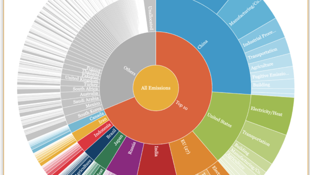 The top three GHG emitters- China, EU and USA contribute 41.5% of the total global emissions while the bottom 100 countries account for only 3.6%. Collectively the top 10 emitters account for over two third of the global GHG emissions according to WRI.